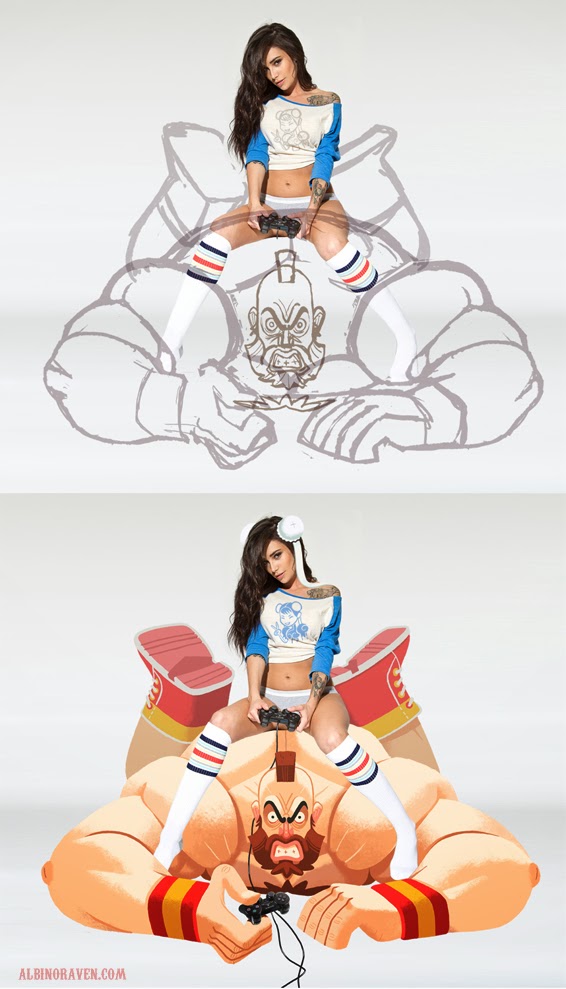 I like including elements in my drawings that you can only get away with in illustration, like using the impossible size of a charterer like Zangief to create contrast with other figures. I was curious to see what that would be like when an actual person was involved, which is what lead to this idea. (That and my love of Zangief.)